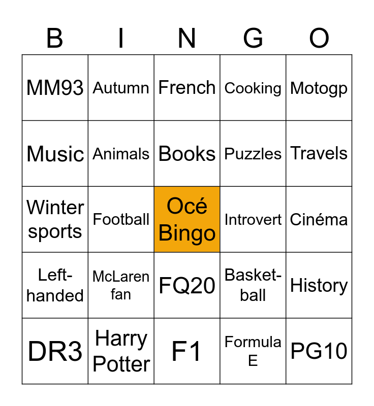 This bingo card has a free space and 24 words: McLaren fan, Harry Potter, Books, DR3, Motogp, MM93, Music, Autumn, Introvert, FQ20, Puzzles, Winter sports, Basket-ball, History, Animals, Formula E, Cinéma, French, Travels, Football, PG10, Left-handed, Cooking and F1.