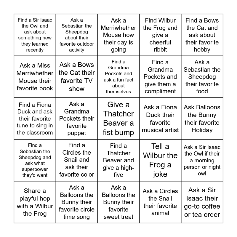 This bingo card has a free space and 24 words: Find a Circles the Snail and ask their favorite color, Ask a Balloons the Bunny their favorite circle time song, Find a Grandma Pockets and ask a fun fact about themselves, Share a playful hop with a Wilbur the Frog, Find a Bows the Cat and ask about their favorite hobby, Find a Sir Isaac the Owl and ask about something new they learned recently, Ask a Miss Merriwhether Mouse their favorite book, Ask a Sebastian the Sheepdog about their favorite outdoor activity, Ask a Fiona Duck their favorite musical artist, Find a Thatcher Beaver and give a high-five, Find a Grandma Pockets and give them a compliment, Find a Fiona Duck and ask their favorite tune to sing in the classroom, Tell a Wilbur the Frog a joke, Ask a Sir Isaac the Owl if their a morning person or night owl, Ask a Bows the Cat their favorite TV show, Ask a Circles the Snail their favorite animal, Ask Balloons the Bunny their favorite Holiday, Ask a Merriwhether Mouse how their day is going, Ask a Sebastian the Sheepdog their favorite food, Ask a Grandma Pockets their favorite puppet, Ask a Sir Isaac their go-to coffee or tea order, Find a Sebastian the Sheepdog and ask what superpower they'd want, Find Wilbur the Frog and give a cheerful ribbit and Ask a Balloons the Bunny their favorite sweet treat.