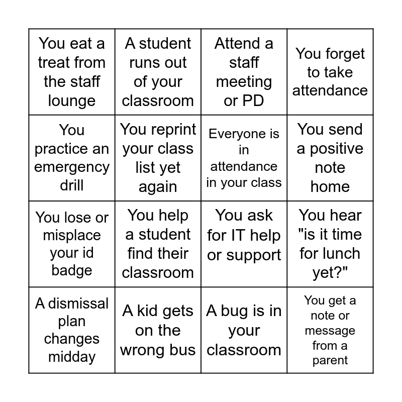 This bingo card has 16 words: A kid gets on the wrong bus, You hear "is it time for lunch yet?", Attend a staff meeting or PD, You eat a treat from the staff lounge, You lose or misplace your id badge, A student runs out of your classroom, You ask for IT help or support, A bug is in your classroom, You practice an emergency drill, You reprint your class list yet again, A dismissal plan changes midday, You forget to take attendance, You help a student find their classroom, You send a positive note home, Everyone is in attendance in your class and You get a note or message from a parent.