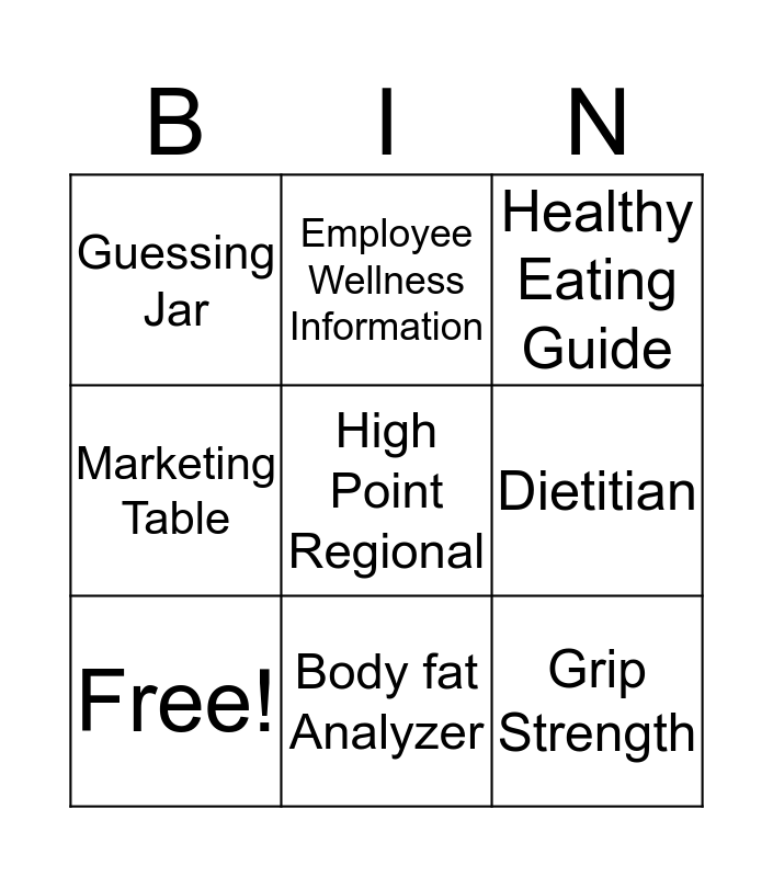 This bingo card has 9 words: Free!, Healthy Eating Guide, Employee Wellness Information, Marketing Table, Guessing Jar, Dietitian, High Point Regional, Grip Strength and Body fat Analyzer.
