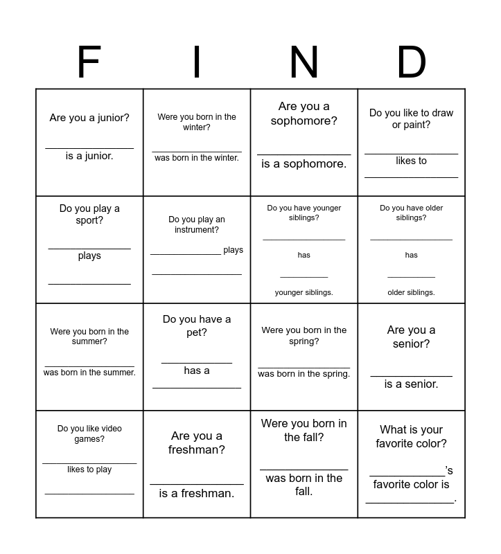 This bingo card has 16 words: Are you a freshman? ______________ is a freshman., Are you a senior? _____________ is a senior., Are you a sophomore? ______________ is a sophomore., Are you a junior? _______________ is a junior., Were you born in the summer? ___________________ was born in the summer., Were you born in the winter? ___________________ was born in the winter., Were you born in the spring? __________________ was born in the spring., Were you born in the fall? ______________ was born in the fall., Do you play a sport? _______________ plays _______________, Do you play an instrument? _______________ plays ___________________, Do you like video games? ____________________ likes to play ___________________, Do you like to draw or paint? _________________ likes to _________________, Do you have a pet? ____________ has a _______________, Do you have older siblings? ___________________ has ___________ older siblings., Do you have younger siblings? ___________________ has ___________ younger siblings. and What is your favorite color? ____________’s favorite color is ______________..