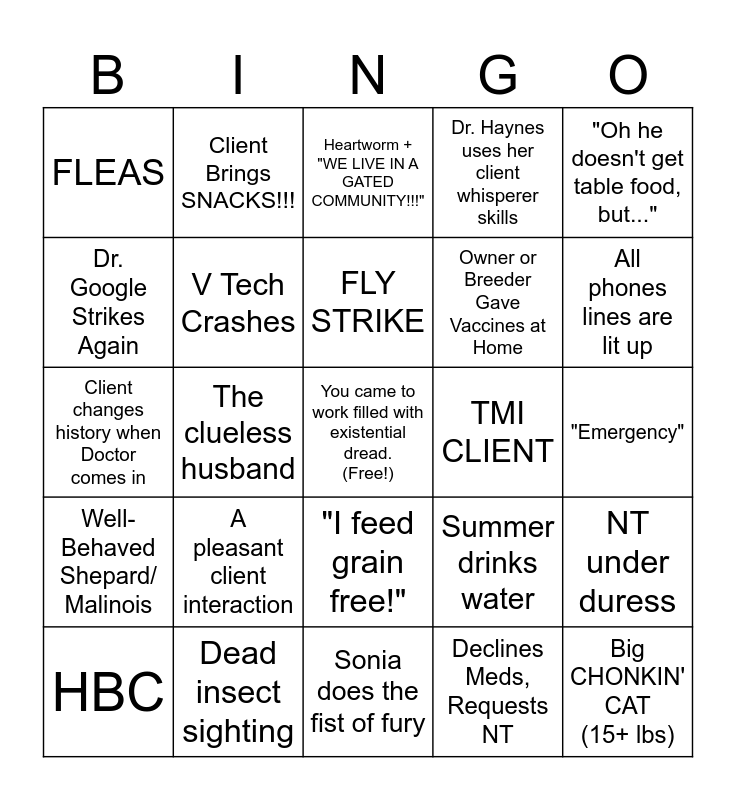 This bingo card has a free space and 24 words: A pleasant client interaction, Dead insect sighting, FLY STRIKE, HBC, "Oh he doesn't get table food, but...", FLEAS, Dr. Google Strikes Again, Client Brings SNACKS!!!, TMI CLIENT, "I feed grain free!", Owner or Breeder Gave Vaccines at Home, Client changes history when Doctor comes in, Summer drinks water, NT under duress, V Tech Crashes, Declines Meds, Requests NT, "Emergency", Heartworm + "WE LIVE IN A GATED COMMUNITY!!!", All phones lines are lit up, The clueless husband, Big CHONKIN' CAT (15+ lbs), Well-Behaved Shepard/ Malinois, Dr. Haynes uses her client whisperer skills and Sonia does the fist of fury.