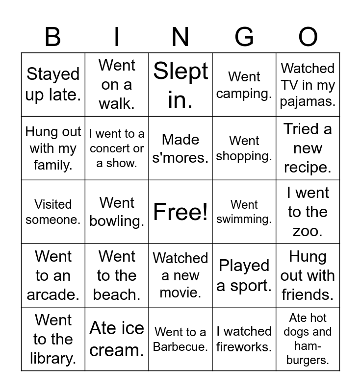This bingo card has a free space and 24 words: Went to the beach., Ate ice cream., Made s'mores., Went to the library., Watched TV in my pajamas., Stayed up late., Hung out with my family., Went on a walk., Went swimming., Watched a new movie., Went shopping., Visited someone., Played a sport., Hung out with friends., I went to a concert or a show., I watched fireworks., I went to the zoo., Slept in., Tried a new recipe., Went bowling., Ate hot dogs and ham-burgers., Went to an arcade., Went camping. and Went to a Barbecue..
