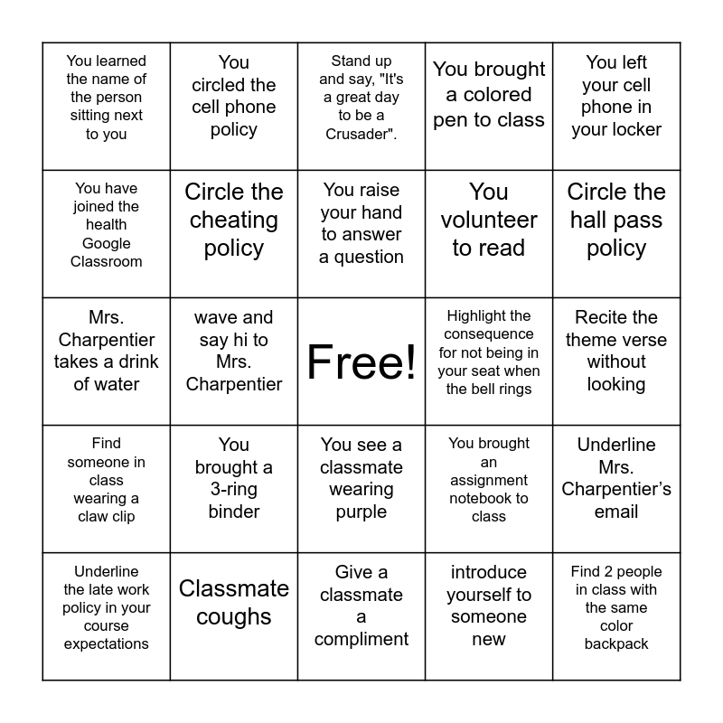 This bingo card has a free space and 24 words: You brought a 3-ring binder, Classmate coughs, You raise your hand to answer a question, Underline the late work policy in your course expectations, You left your cell phone in your locker, You learned the name of the person sitting next to you, You have joined the health Google Classroom, You circled the cell phone policy, Highlight the consequence for not being in your seat when the bell rings, You see a classmate wearing purple, You volunteer to read, Mrs. Charpentier takes a drink of water, You brought an assignment notebook to class, Underline Mrs. Charpentier’s email, Circle the cheating policy, introduce yourself to someone new, Recite the theme verse without looking, Stand up and say, "It's a great day to be a Crusader"., Circle the hall pass policy, wave and say hi to Mrs. Charpentier, Find 2 people in class with the same color backpack, Find someone in class wearing a claw clip, You brought a colored pen to class and Give a classmate a compliment.