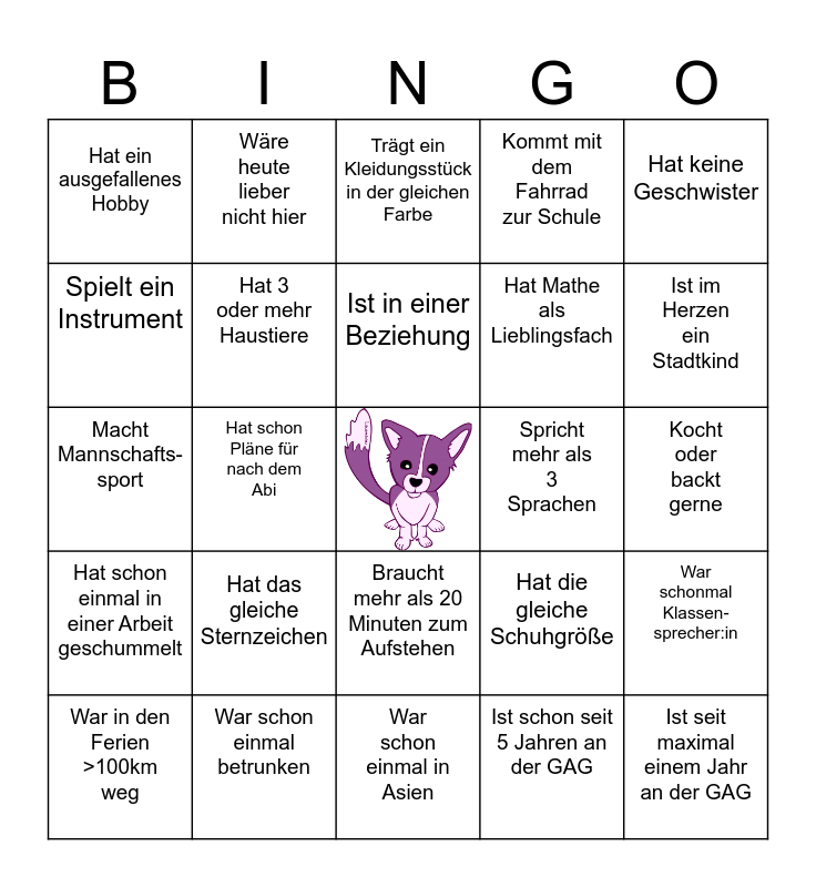 This bingo card has a free space and 24 words: Hat das gleiche Sternzeichen, War schon einmal betrunken, Ist in einer Beziehung, War in den Ferien >100km weg, Hat keine Geschwister, Hat ein ausgefallenes Hobby, Spielt ein Instrument, Wäre heute lieber nicht hier, Spricht mehr als 3 Sprachen, Braucht mehr als 20 Minuten zum Aufstehen, Hat Mathe als Lieblingsfach, Macht Mannschafts- sport, Hat die gleiche Schuhgröße, War schonmal Klassen- sprecher:in, Hat 3 oder mehr Haustiere, Ist schon seit 5 Jahren an der GAG, Kocht oder backt gerne, Trägt ein Kleidungsstück in der gleichen Farbe, Ist im Herzen ein Stadtkind, Hat schon Pläne für nach dem Abi, Ist seit maximal einem Jahr an der GAG, Hat schon einmal in einer Arbeit geschummelt, Kommt mit dem Fahrrad zur Schule and War schon einmal in Asien.