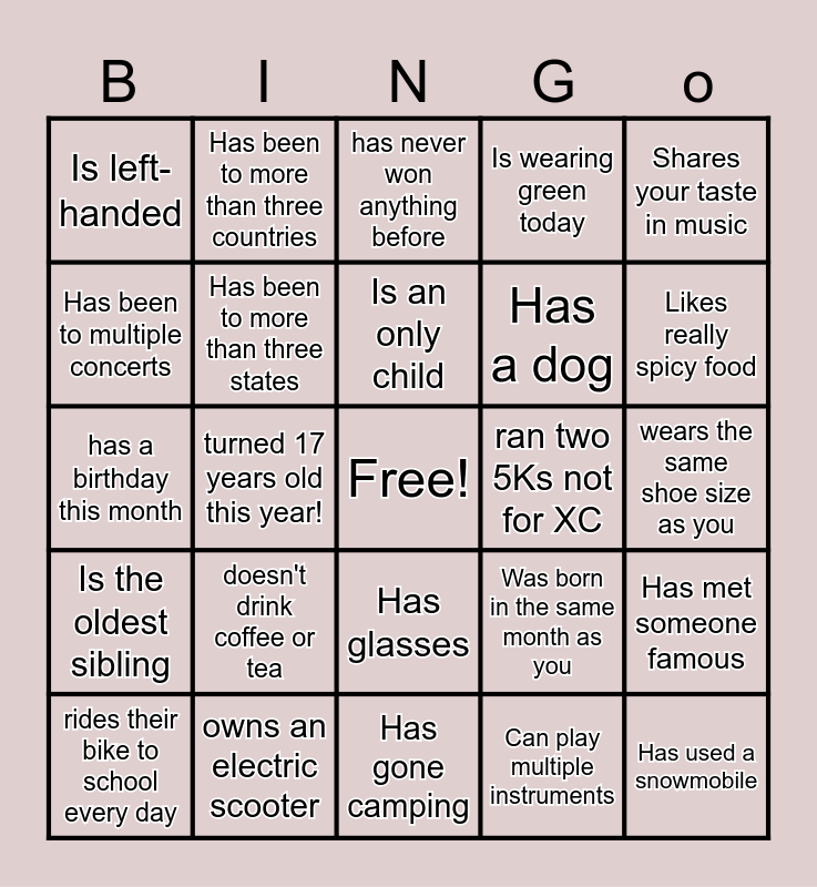 This bingo card has a free space and 24 words: rides their bike to school every day, doesn't drink coffee or tea, Is an only child, Can play multiple instruments, Shares your taste in music, Is left-handed, Has been to more than three countries, has never won anything before, ran two 5Ks not for XC, wears the same shoe size as you, has a birthday this month, Has been to more than three states, Was born in the same month as you, Has met someone famous, Has been to multiple concerts, owns an electric scooter, Has gone camping, Is wearing green today, Likes really spicy food, Is the oldest sibling, turned 17 years old this year!, Has glasses, Has a dog and Has used a snowmobile.