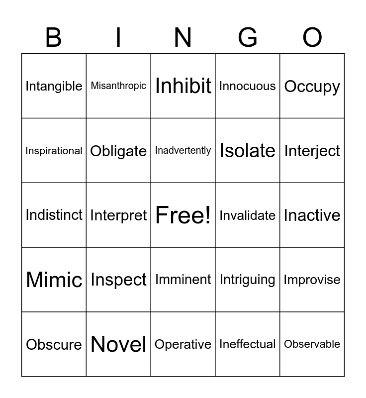 This bingo card has a free space and 88 words: Imaginative, Imitation, Imminent, Immune, Impartial, Impending, Impenetrable, Imperceptible, Implement, Implication, Implicit, Impractical, Improvise, Inactive, Inadequate, Inadvertently, Incite, Inconspicuous, Indecipherable, Indicate, Indifference, Indisputable, Indistinct, Indulge, Ineffectual, Inevitable, Inexpensive, Inexplicable, Influence, Infrequent, Inhibit, Innocuous, Insensible, Insignificant, Inspect, Inspirational, Intangible, Intentional, Interchangeable, Interject, Interpret, Intersect, Intricate, Intriguing, Invalidate, Invent, Investigation, Involuntarily, Irrelevant, Isolate, Lacking, Latent, Legitimate, Localized, Manageable, Mandatory, Mimic, Misanthropic, Misrepresent, Moderate, Multifaceted, Neglect, Neutrality, Newfound, Notional, Novel, Nuanced, Obligate, Obscure, Observable, Observant, Obsolete, Obstructed, Occupy, Oddity, Offhand, Omnipotent, Onset, Operative, Ornamental, Oust, Outstrip, Overcome, Overlook, Overreact, Overshadow, Overtly and Overwhelmed.