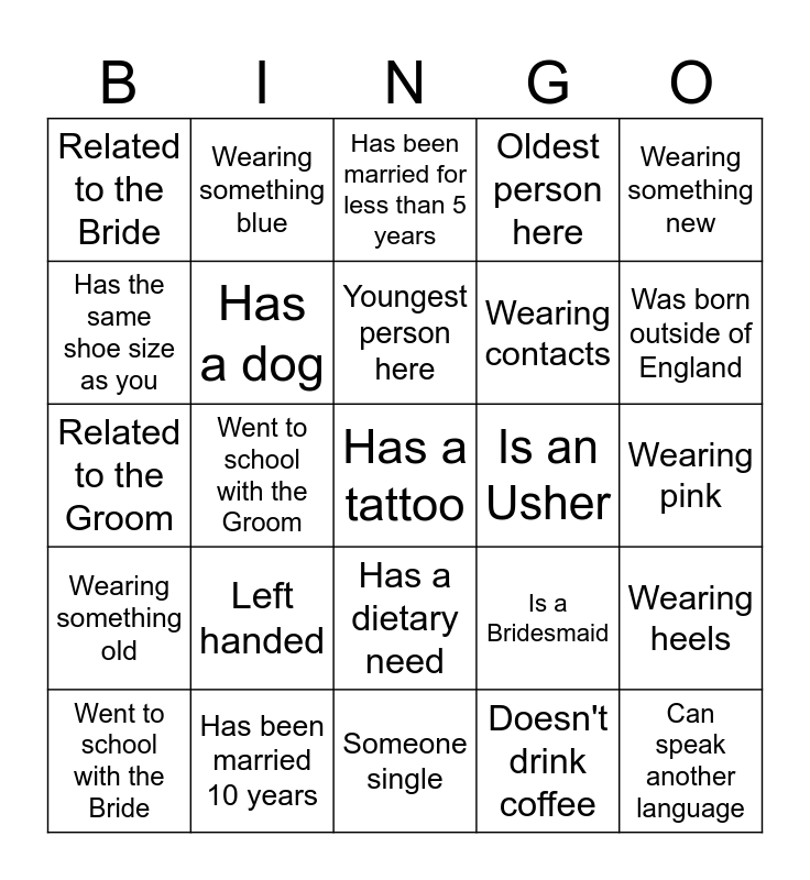 This bingo card has 25 words: Left handed, Someone single, Youngest person here, Went to school with the Bride, Wearing something new, Related to the Bride, Has the same shoe size as you, Wearing something blue, Is an Usher, Has a dietary need, Wearing contacts, Related to the Groom, Is a Bridesmaid, Wearing heels, Has a dog, Can speak another language, Wearing pink, Has been married for less than 5 years, Was born outside of England, Went to school with the Groom, Has a tattoo, Has been married 10 years, Wearing something old, Oldest person here and Doesn't drink coffee.