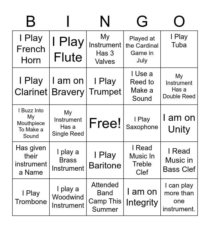 This bingo card has a free space and 24 words: I play a Brass Instrument, I play a Woodwind Instrument, I Play Trumpet, I Play Trombone, I Play Tuba, I Play French Horn, I Play Clarinet, I Play Flute, I Play Saxophone, I Play Baritone, I Use a Reed to Make a Sound, I Buzz Into My Mouthpiece To Make a Sound, I Read Music In Treble Clef, I Read Music in Bass Clef, I am on Bravery, I am on Integrity, I am on Unity, My Instrument Has 3 Valves, My Instrument Has a Double Reed, My Instrument Has a Single Reed, I can play more than one instrument., Has given their instrument a Name, Played at the Cardinal Game in July and Attended Band Camp This Summer.