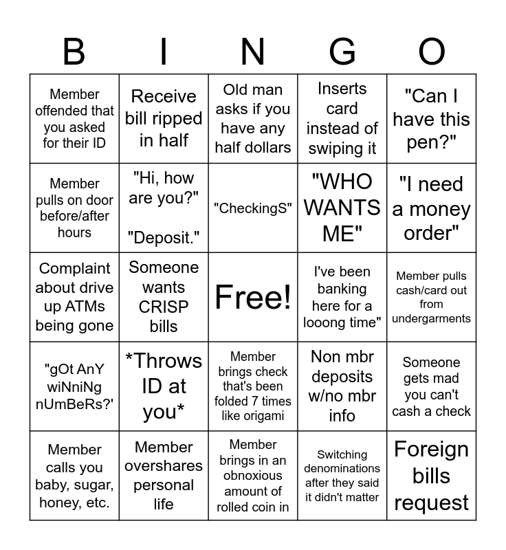 This bingo card has a free space and 24 words: *Throws ID at you*, Member overshares personal life, "CheckingS", Member calls you baby, sugar, honey, etc., "Can I have this pen?", Member offended that you asked for their ID, Member pulls on door before/after hours, Receive bill ripped in half, I've been banking here for a looong time", Member brings check that's been folded 7 times like origami, "WHO WANTS ME", Complaint about drive up ATMs being gone, Non mbr deposits w/no mbr info, Someone gets mad you can't cash a check, "Hi, how are you?" "Deposit.", Switching denominations after they said it didn't matter, Member pulls cash/card out from undergarments, Old man asks if you have any half dollars, "I need a money order", Someone wants CRISP bills, Foreign bills request, "gOt AnY wiNniNg nUmBeRs?', Inserts card instead of swiping it and Member brings in an obnoxious amount of rolled coin in.