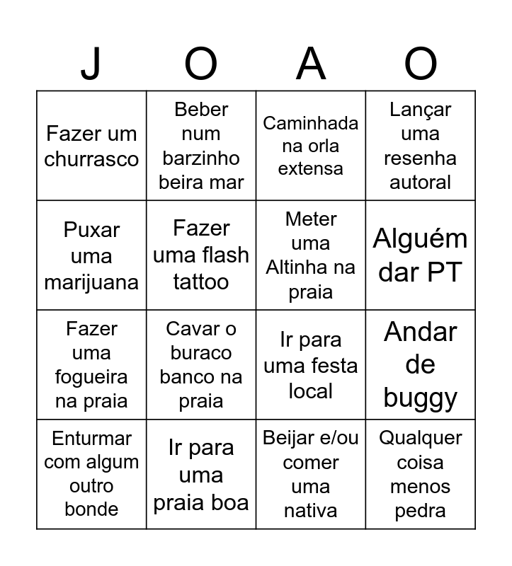 This bingo card has 16 words: Ir para uma praia boa, Andar de buggy, Caminhada na orla extensa, Fazer um churrasco, Fazer uma fogueira na praia, Beber num barzinho beira mar, Ir para uma festa local, Beijar e/ou comer uma nativa, Puxar uma marijuana, Fazer uma flash tattoo, Enturmar com algum outro bonde, Lançar uma resenha autoral, Cavar o buraco banco na praia, Alguém dar PT, Meter uma Altinha na praia and Qualquer coisa menos pedra.