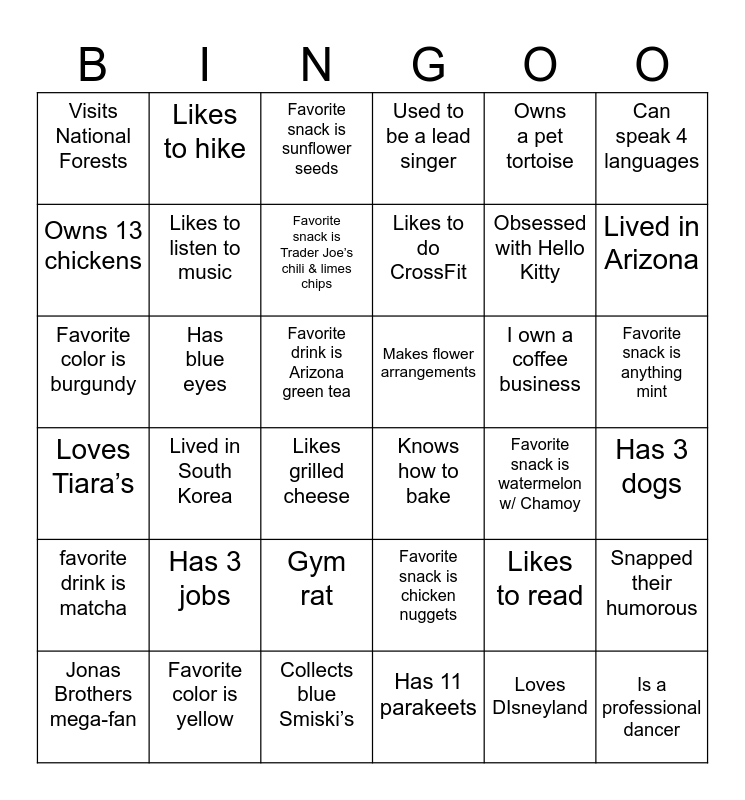 This bingo card has 36 words: Loves Tiara’s, Lived in South Korea, Collects blue Smiski’s, Likes to do CrossFit, I own a coffee business, Favorite snack is anything mint, Visits National Forests, Favorite color is yellow, Favorite snack is sunflower seeds, Favorite snack is chicken nuggets, Obsessed with Hello Kitty, Can speak 4 languages, favorite drink is matcha, Has blue eyes, Favorite snack is Trader Joe’s chili & limes chips, Used to be a lead singer, Likes to read, Has 3 dogs, Owns 13 chickens, Likes to listen to music, Likes grilled cheese, Knows how to bake, Favorite snack is watermelon w/ Chamoy, Snapped their humorous, Favorite color is burgundy, Likes to hike, Favorite drink is Arizona green tea, Has 11 parakeets, Owns a pet tortoise, Lived in Arizona, Jonas Brothers mega-fan, Has 3 jobs, Gym rat, Makes flower arrangements, Loves DIsneyland and Is a professional dancer.