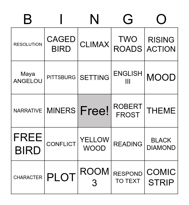 This bingo card has a free space and 24 words: CONFLICT, PLOT, SETTING, CHARACTER, RISING ACTION, RESOLUTION, Maya ANGELOU, CAGED BIRD, ROBERT FROST, YELLOW WOOD, ENGLISH III, NARRATIVE, READING, BLACK DIAMOND, PITTSBURG, RESPOND TO TEXT, THEME, CLIMAX, MOOD, MINERS, COMIC STRIP, FREE BIRD, TWO ROADS and ROOM 3.