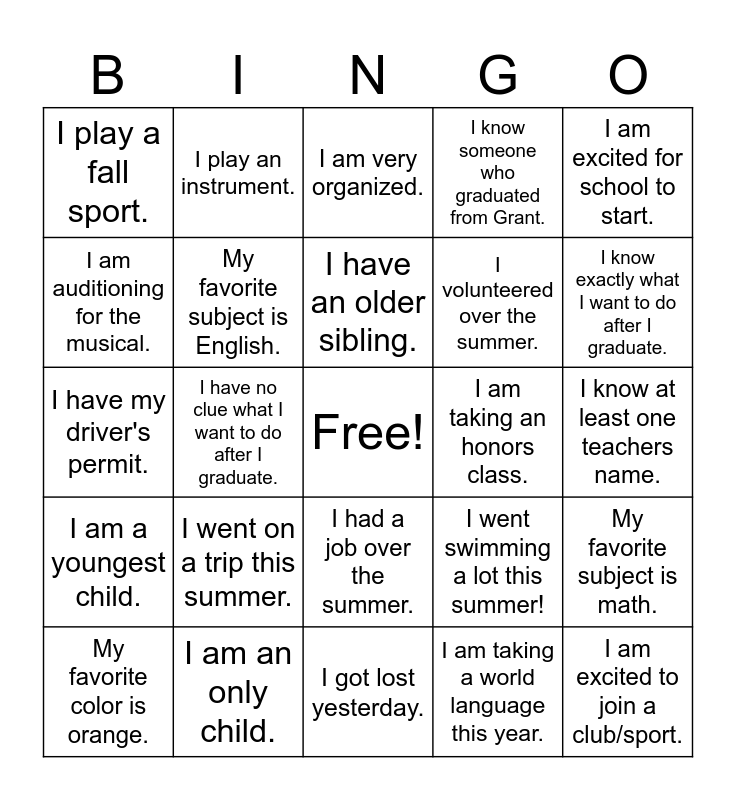 This bingo card has a free space and 24 words: I went on a trip this summer., I am an only child., I have an older sibling., My favorite color is orange., I am excited for school to start., I play a fall sport., I am auditioning for the musical., I play an instrument., I am taking an honors class., I had a job over the summer., I volunteered over the summer., I have my driver's permit., I went swimming a lot this summer!, My favorite subject is math., My favorite subject is English., I am taking a world language this year., I know at least one teachers name., I am very organized., I know exactly what I want to do after I graduate., I have no clue what I want to do after I graduate., I am excited to join a club/sport., I am a youngest child., I know someone who graduated from Grant. and I got lost yesterday..