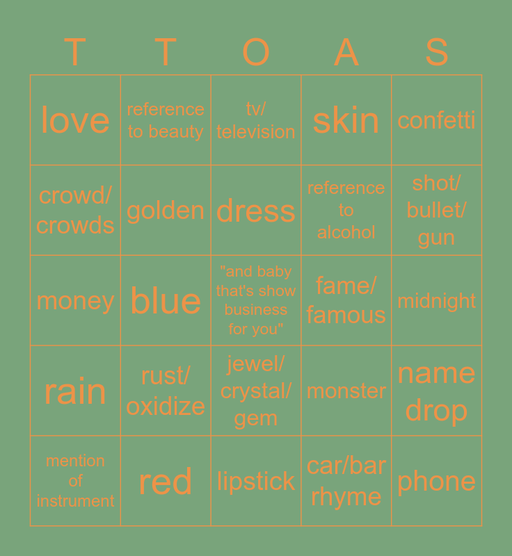 This bingo card has a free space and 24 words: rust/ oxidize, red, dress, mention of instrument, confetti, love, crowd/ crowds, reference to beauty, fame/ famous, jewel/ crystal/ gem, reference to alcohol, money, monster, name drop, golden, car/bar rhyme, midnight, tv/ television, shot/ bullet/ gun, blue, phone, rain, skin and lipstick.