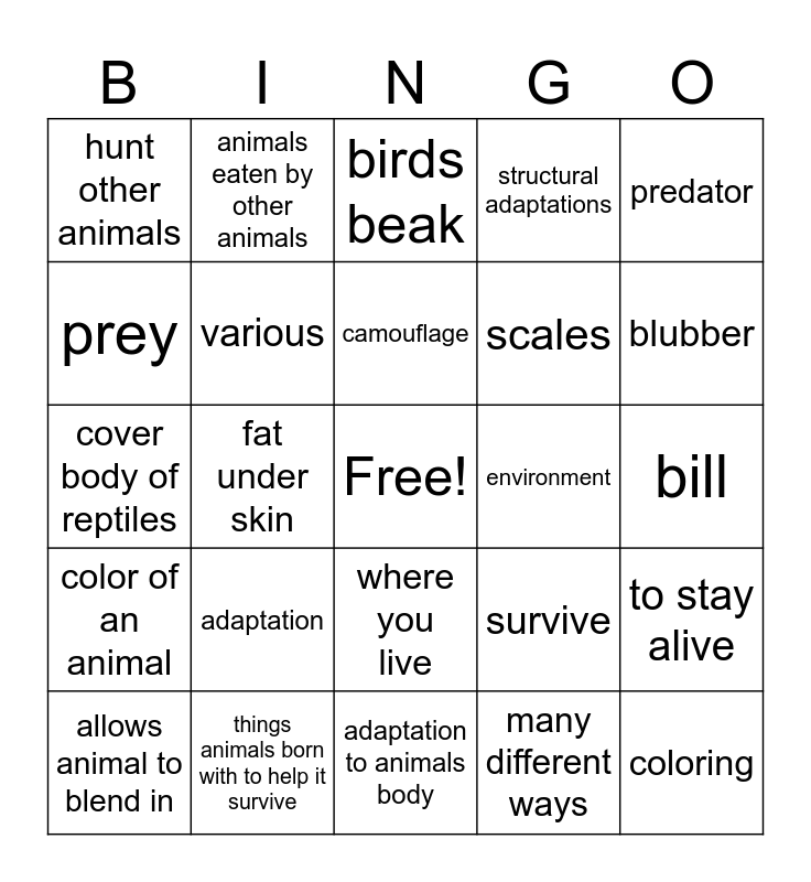 This bingo card has a free space and 24 words: adaptation, things animals born with to help it survive, camouflage, allows animal to blend in, predator, hunt other animals, prey, animals eaten by other animals, environment, where you live, scales, cover body of reptiles, survive, to stay alive, various, many different ways, bill, birds beak, blubber, fat under skin, coloring, color of an animal, structural adaptations and adaptation to animals body.