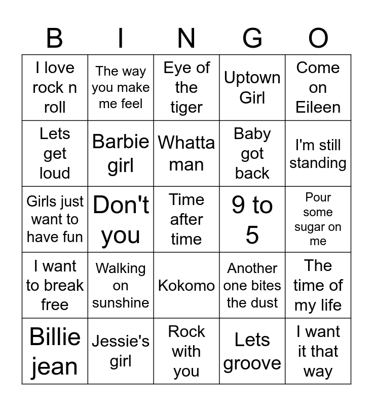 This bingo card has 45 words: Take me on, Time after time, Every breath you take, Billie jean, I wanna dance with somebody, Lets groove, Eye of the tiger, Material girl, Come on Eileen, Jessie's girl, Uptown Girl, 9 to 5, Kokomo, Walking on sunshine, I'm coming out, Rock with you, You make my dreams, Girls just want to have fun, Wake me up before you go-go, I'm still standing, The way you make me feel, Any way you want it, Like a virgin, I love rock n roll, Crazy little thing called love, Pour some sugar on me, We didn't start the fire, Don't stop till you get enough, Another one bites the dust, I want to break free, Should I stay or should I go, The time of my life, I'm gonna be, Beat it, Were not gonna take it, Don't you, We are family, Wanted dead or alive, I want it that way, Whatta man, Lets get loud, Baby got back, This is how we do it, Barbie girl and Shoop.