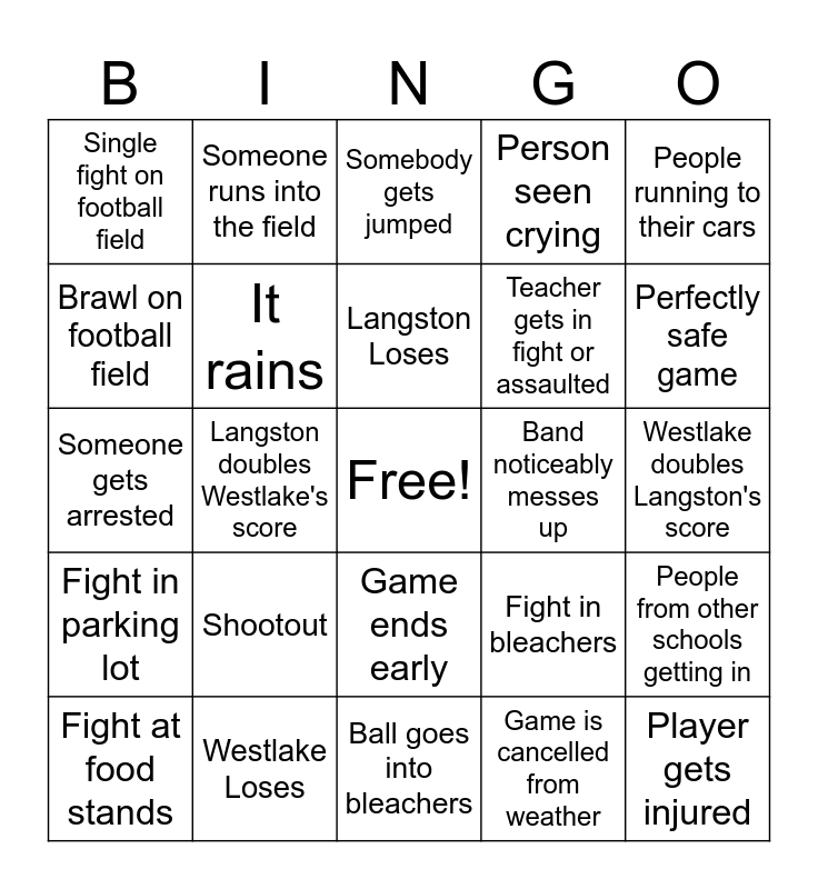 This bingo card has a free space and 24 words: Shootout, Westlake Loses, Langston Loses, Fight at food stands, People running to their cars, Single fight on football field, Brawl on football field, Someone runs into the field, Band noticeably messes up, Game ends early, Teacher gets in fight or assaulted, Someone gets arrested, Fight in bleachers, People from other schools getting in, It rains, Game is cancelled from weather, Westlake doubles Langston's score, Somebody gets jumped, Perfectly safe game, Langston doubles Westlake's score, Player gets injured, Fight in parking lot, Person seen crying and Ball goes into bleachers.