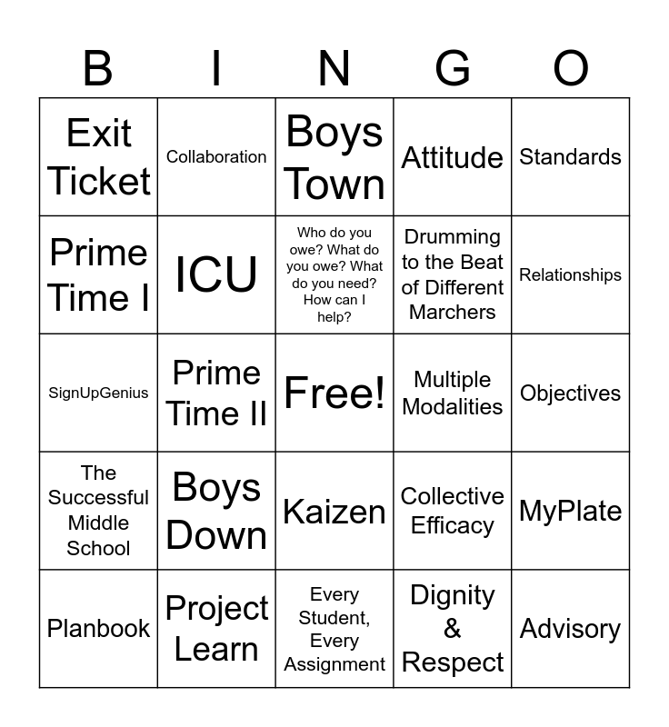 This bingo card has a free space and 68 words: Intelligence Plus Character, Advisory, Teaming, Arrow Time, PLC, Literacy, Collaboration, Irrefutable Evidence, Who do you owe? What do you owe? What do you need? How can I help?, Sho-Shin, Kaizen, Back to School Challenge, Objectives, Standards, Reteach or Relearn, Prime Time I, Prime Time II, Exit Ticket, Bellringer, Boys Down, Drumming to the Beat of Different Marchers, Collective Efficacy, The Successful Middle School, Norms, Communication Log, Above/Below the Line, Professional Growth Rubric, Teachable Moment, MyPlate, Social Skill, Boys Town, Conferencing, Second Step, Lessons from the Geese, Attitude, Positivity, Lesson Design, Planbook, Relationships, SignUpGenius, Back to School Conferences, Professional Development, ICU, ALEKS, Intervention, Enrichment, Belonging, Team Resume, Multiple Modalities, Project Learn, One Crazy Person or Two, Quality Components, Refocus Room, Every Student, Every Assignment, Cell Phones, Ear Buds, Dignity & Respect, Paraprofessionals, Time & Support, Literacy, Technology, Instructional Strategies, Be TRRFCC, Be an Arrow of Character, Young Adolescent, Any fat guy joke, Any bald joke and Kids don’t care how much you know until they know how much you care.