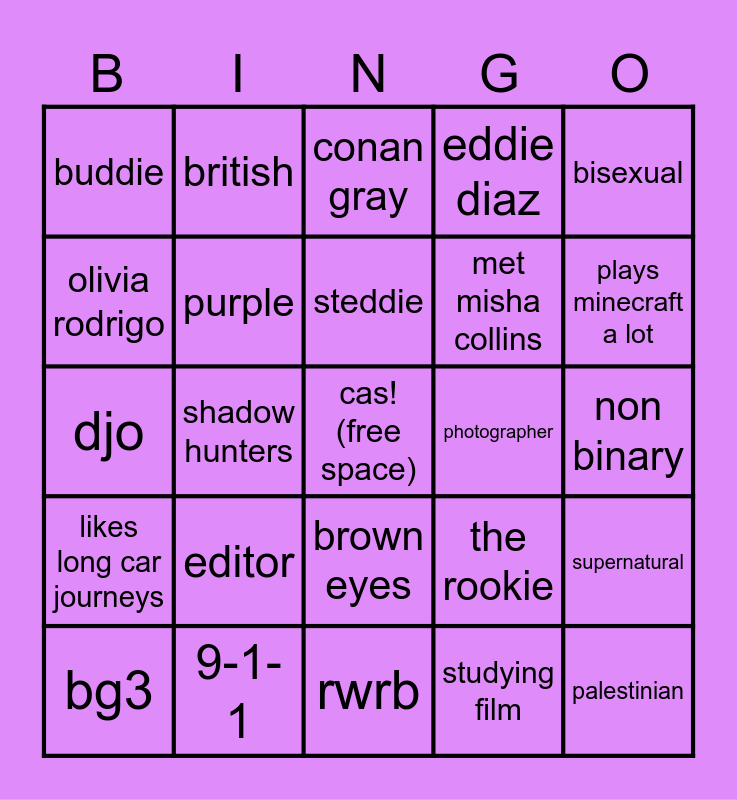This bingo card has a free space and 24 words: editor, 9-1-1, steddie, bg3, bisexual, buddie, olivia rodrigo, british, photographer, brown eyes, met misha collins, djo, the rookie, supernatural, purple, studying film, non binary, conan gray, plays minecraft a lot, shadow hunters, palestinian, likes long car journeys, eddie diaz and rwrb.