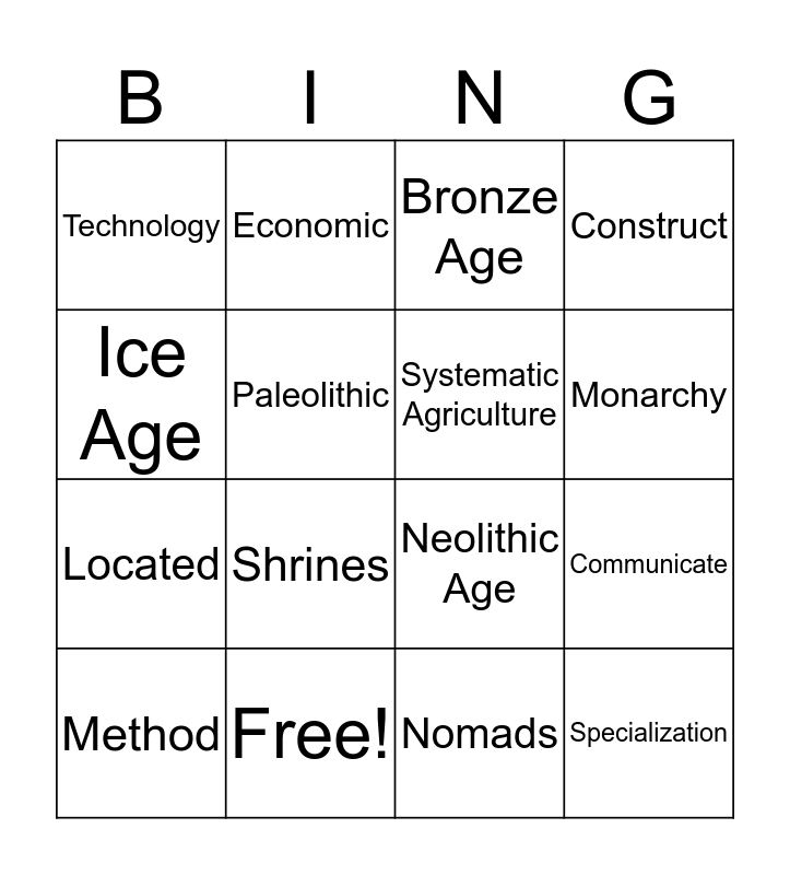 This bingo card has 16 words: Free!, Communicate, Bronze Age, Technology, Located, Economic, Neolithic Age, Nomads, Ice Age, Paleolithic, Method, Construct, Shrines, Monarchy, Systematic Agriculture and Specialization.