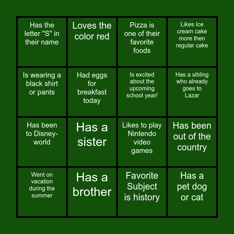 This bingo card has 16 words: Has a brother, Has been out of the country, Pizza is one of their favorite foods, Has the letter "S" in their name, Has been to Disney-world, Loves the color red, Likes to play Nintendo video games, Favorite Subject is history, Is wearing a black shirt or pants, Had eggs for breakfast today, Went on vacation during the summer, Likes Ice cream cake more then regular cake, Has a sister, Has a sibling who already goes to Lazar, Is excited about the upcoming school year! and Has a pet dog or cat.