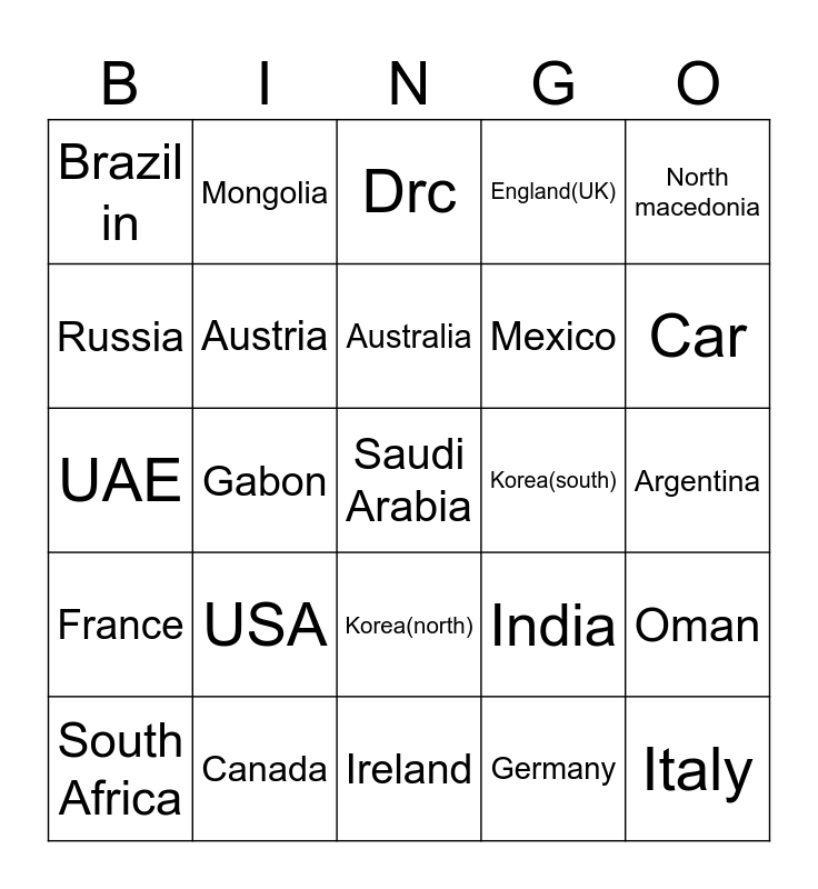 This bingo card has a free space and 24 words: USA, Canada, Australia, South Africa, North macedonia, Brazil in, Russia, Mongolia, Korea(south), Korea(north), Mexico, UAE, India, Oman, Austria, Germany, Argentina, Drc, Car, Gabon, Italy, France, England(UK) and Ireland.