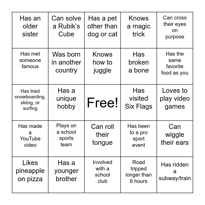 This bingo card has a free space and 24 words: Plays on a school sports team, Has a younger brother, Knows how to juggle, Likes pineapple on pizza, Can cross their eyes on purpose, Has an older sister, Has met someone famous, Can solve a Rubik’s Cube, Has visited Six Flags, Can roll their tongue, Has broken a bone, Has tried snowboarding, skiing, or surfing, Has been to a pro sport event, Can wiggle their ears, Was born in another country, Road tripped longer than 6 hours, Loves to play video games, Has a pet other than dog or cat, Has the same favorite food as you, Has a unique hobby, Has ridden a subway/train, Has made a YouTube video, Knows a magic trick and Involved with a school club.