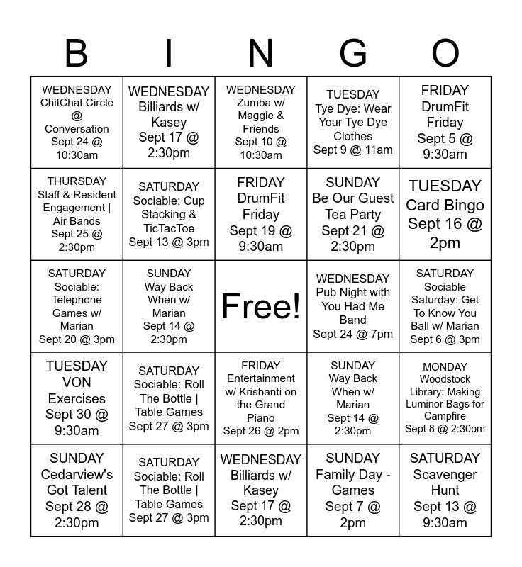 This bingo card has a free space and 24 words: SATURDAY Sociable: Roll The Bottle | Table Games Sept 27 @ 3pm, SATURDAY Sociable: Roll The Bottle | Table Games Sept 27 @ 3pm, FRIDAY DrumFit Friday Sept 19 @ 9:30am, SUNDAY Cedarview's Got Talent Sept 28 @ 2:30pm, FRIDAY DrumFit Friday Sept 5 @ 9:30am, WEDNESDAY ChitChat Circle @ Conversation Sept 24 @ 10:30am, THURSDAY Staff & Resident Engagement | Air Bands Sept 25 @ 2:30pm, WEDNESDAY Billiards w/ Kasey Sept 17 @ 2:30pm, WEDNESDAY Pub Night with You Had Me Band Sept 24 @ 7pm, FRIDAY Entertainment w/ Krishanti on the Grand Piano Sept 26 @ 2pm, SUNDAY Be Our Guest Tea Party Sept 21 @ 2:30pm, SATURDAY Sociable: Telephone Games w/ Marian Sept 20 @ 3pm, SUNDAY Way Back When w/ Marian Sept 14 @ 2:30pm, MONDAY Woodstock Library: Making Luminor Bags for Campfire Sept 8 @ 2:30pm, SATURDAY Sociable: Cup Stacking & TicTacToe Sept 13 @ 3pm, SUNDAY Family Day - Games Sept 7 @ 2pm, SATURDAY Sociable Saturday: Get To Know You Ball w/ Marian Sept 6 @ 3pm, WEDNESDAY Zumba w/ Maggie & Friends Sept 10 @ 10:30am, TUESDAY Card Bingo Sept 16 @ 2pm, SUNDAY Way Back When w/ Marian Sept 14 @ 2:30pm, SATURDAY Scavenger Hunt Sept 13 @ 9:30am, TUESDAY VON Exercises Sept 30 @ 9:30am, TUESDAY Tye Dye: Wear Your Tye Dye Clothes Sept 9 @ 11am and WEDNESDAY Billiards w/ Kasey Sept 17 @ 2:30pm.