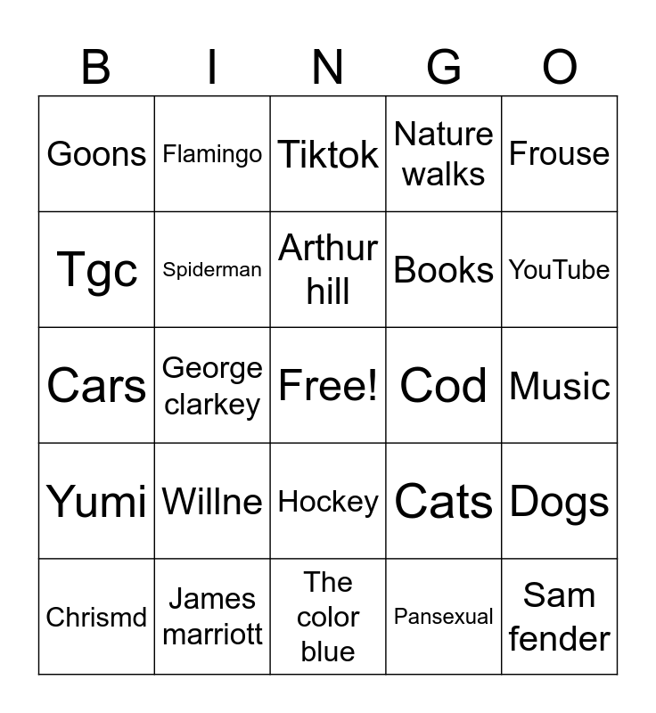 This bingo card has a free space and 24 words: Willne, James marriott, Arthur hill, Chrismd, Frouse, Goons, Tgc, Flamingo, Cod, Hockey, Books, Cars, Cats, Dogs, Spiderman, Pansexual, Music, Tiktok, YouTube, George clarkey, Sam fender, Yumi, Nature walks and The color blue.