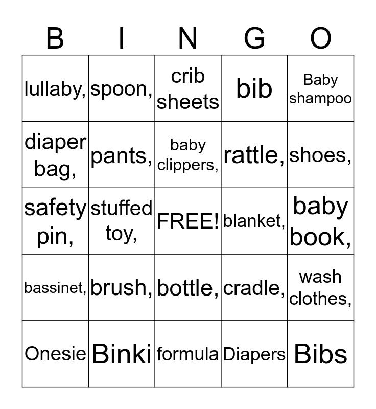 This bingo card has a free space and 43 words: Rubber ducky, Bibs, Socks, Onesie, Sleeper, Diapers, crib sheets, Baby lotion, Baby shampoo, Binki, bib, blanket,, bottle,, brush,, diaper,, formula, rubber ducky,, safety pin,, socks,, shoes,, spoon,, towel,, tub,, lullaby,, pacifier, baby book,, booties,, burp clothes,, cradle,, bassinet,, onesie,, wash clothes,, crib sheets,, stuffed toy,, hats,, night light,, thermometer,, baby clippers,, diaper bag,, rattle,, baby toy,, pants, and sleeper.