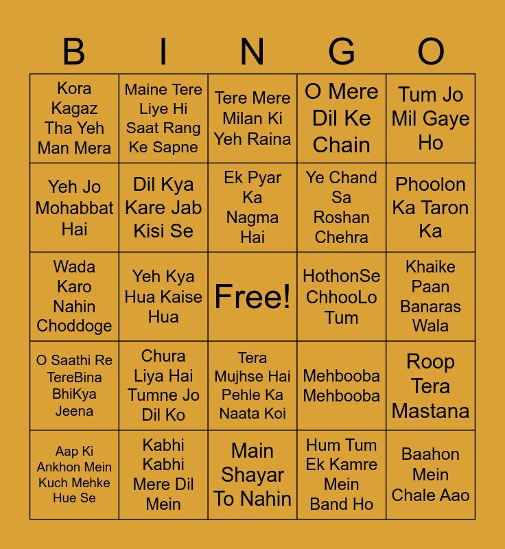 This bingo card has a free space and 24 words: Chura Liya Hai Tumne Jo Dil Ko, Kabhi Kabhi Mere Dil Mein, Ek Pyar Ka Nagma Hai, Aap Ki Ankhon Mein Kuch Mehke Hue Se, Tum Jo Mil Gaye Ho, Kora Kagaz Tha Yeh Man Mera, Yeh Jo Mohabbat Hai, Maine Tere Liye Hi Saat Rang Ke Sapne, HothonSe ChhooLo Tum, Tera Mujhse Hai Pehle Ka Naata Koi, Ye Chand Sa Roshan Chehra, Wada Karo Nahin Choddoge, Mehbooba Mehbooba, Roop Tera Mastana, Dil Kya Kare Jab Kisi Se, Hum Tum Ek Kamre Mein Band Ho, Khaike Paan Banaras Wala, Tere Mere Milan Ki Yeh Raina, Phoolon Ka Taron Ka, Yeh Kya Hua Kaise Hua, Baahon Mein Chale Aao, O Saathi Re TereBina BhiKya Jeena, O Mere Dil Ke Chain and Main Shayar To Nahin.