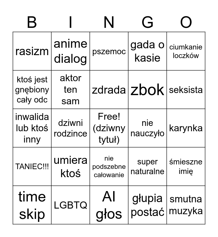 This bingo card has a free space and 24 words: umiera ktoś, LGBTQ, zdrada, time skip, ciumkanie loczków, rasizm, ktoś jest gnębiony cały odc, anime dialog, nie nauczyło, nie podszebne całowanie, zbok, inwalida lub ktoś inny, super naturalne, śmieszne imię, aktor ten sam, głupia postać, karynka, pszemoc, seksista, dziwni rodzince, smutna muzyka, TANIEC!!!, gada o kasie and AI głos.