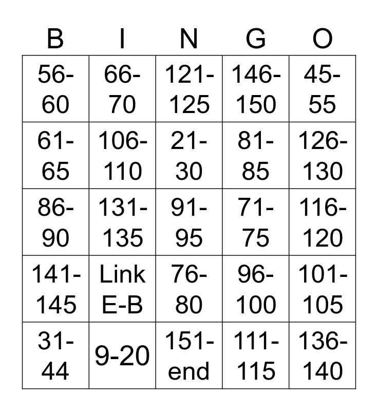This bingo card has a free space and 24 words: Link E-B, 9-20, 21-30, 31-44, 45-55, 56-60, 61-65, 66-70, 71-75, 76-80, 81-85, 86-90, 96-100, 101-105, 106-110, 111-115, 116-120, 121-125, 126-130, 131-135, 136-140, 141-145, 146-150 and 151-end.