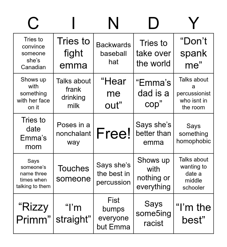 This bingo card has a free space and 24 words: Touches someone, “I’m straight”, “Hear me out”, “Rizzy Primm”, “Don’t spank me”, Tries to convince someone she’s Canadian, Shows up with something with her face on it, Tries to fight emma, Says she’s better than emma, Says she’s the best in percussion, “Emma’s dad is a cop”, Tries to date Emma’s mom, Shows up with nothing or everything, Talks about wanting to date a middle schooler, Talks about frank drinking milk, Says some5ing racist, Says something homophobic, Backwards baseball hat, Talks about a percussionist who isnt in the room, Poses in a nonchalant way, “I’m the best”, Says someone’s name three times when talking to them, Tries to take over the world and Fist bumps everyone but Emma.