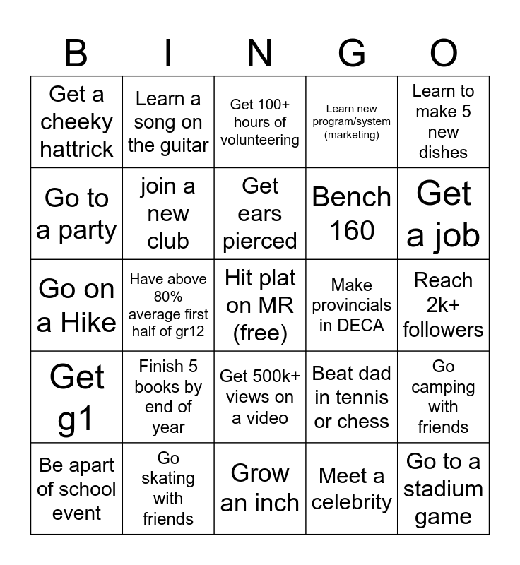 This bingo card has a free space and 24 words: Finish 5 books by end of year, Go skating with friends, Get ears pierced, Be apart of school event, Learn to make 5 new dishes, Get a cheeky hattrick, Go to a party, Learn a song on the guitar, Make provincials in DECA, Get 500k+ views on a video, Bench 160, Go on a Hike, Beat dad in tennis or chess, Go camping with friends, join a new club, Meet a celebrity, Reach 2k+ followers, Get 100+ hours of volunteering, Get a job, Have above 80% average first half of gr12, Go to a stadium game, Get g1, Learn new program/system (marketing) and Grow an inch.