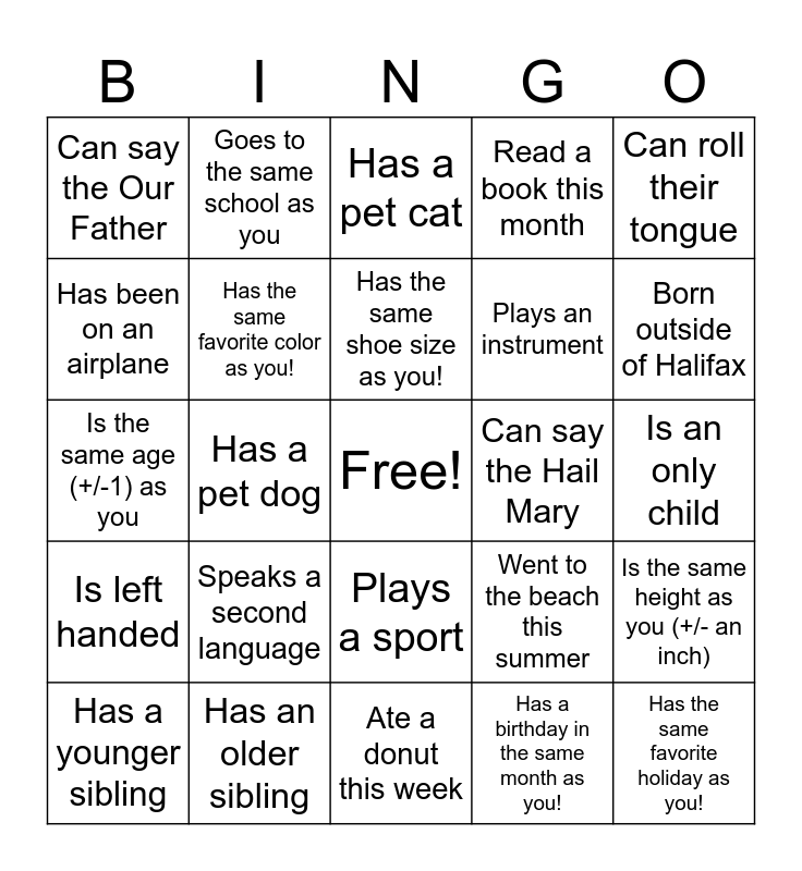 This bingo card has a free space and 24 words: Speaks a second language, Has an older sibling, Has the same shoe size as you!, Has a younger sibling, Can roll their tongue, Can say the Our Father, Has been on an airplane, Goes to the same school as you, Can say the Hail Mary, Plays a sport, Plays an instrument, Is the same age (+/-1) as you, Went to the beach this summer, Is the same height as you (+/- an inch), Has the same favorite color as you!, Has a birthday in the same month as you!, Is an only child, Has a pet cat, Born outside of Halifax, Has a pet dog, Has the same favorite holiday as you!, Is left handed, Read a book this month and Ate a donut this week.