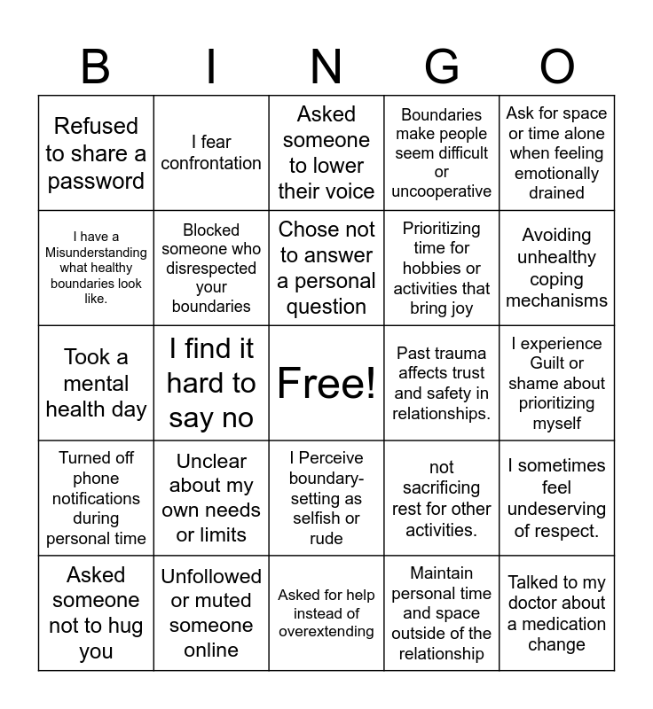 This bingo card has a free space and 29 words: Said “I’m not comfortable talking about that”, Unfollowed or muted someone online, Asked someone to lower their voice, I shut down when overwhelmed, Ask for space or time alone when feeling emotionally drained, Refused to share a password, Blocked someone who disrespected your boundaries, Chose not to answer a personal question, Past trauma affects trust and safety in relationships., I sometimes feel undeserving of respect., Asked someone not to hug you, I find it hard to say no, Maintain personal time and space outside of the relationship, Talked to my doctor about a medication change, Took a mental health day, Set rules around your personal space, Asked for help instead of overextending, not sacrificing rest for other activities., Avoiding unhealthy coping mechanisms, Turned off phone notifications during personal time, Unclear about my own needs or limits, took a break at work away from work station, Prioritizing time for hobbies or activities that bring joy, I experience Guilt or shame about prioritizing myself, I have a Misunderstanding what healthy boundaries look like., I fear confrontation, I Perceive boundary-setting as selfish or rude, Boundaries make people seem difficult or uncooperative and boundaries are selfish.