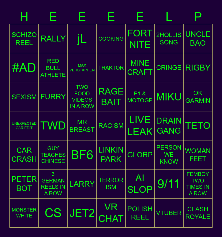 This bingo card has a free space and 48 words: AI SLOP, CRINGE, VR CHAT, TWD, TWO FOOD VIDEOS IN A ROW, TETO, RALLY, CS, 2HOLLIS SONG, LINKIN PARK, UNCLE BAO, COOKING, MIKU, F1 & MOTOGP, PETER BOT, DRAIN GANG, #AD, RIGBY, 9/11, FORT NITE, MINE CRAFT, MR BREAST, SCHIZO REEL, RED BULL ATHLETE, FEMBOY TWO TIMES IN A ROW, MAX VERSTAPPEN, OK GARMIN, MONSTER WHITE, RAGE BAIT, FURRY, VTUBER, LIVE LEAK, WOMAN FEET, 3 GERMAN REELS IN A ROW, UNEXPECTED CAR EDIT, GLORP, PERSON WE KNOW, SEXISM, BF6, LARRY, CAR CRASH, CLASH ROYALE, jL, JET2, TRAKTOR, TERROR ISM, GUY TEACHES CHINESE and POLISH REEL.