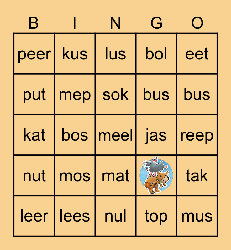 This bingo card has 1 images and 26 words: mus, bus, nul, put, lus, kus, nut, jas, tak, kat, bol, leer, lees, bus, bal, mep, sok, mos, peer, reep, top, bos, meel, mat, eet and los.
