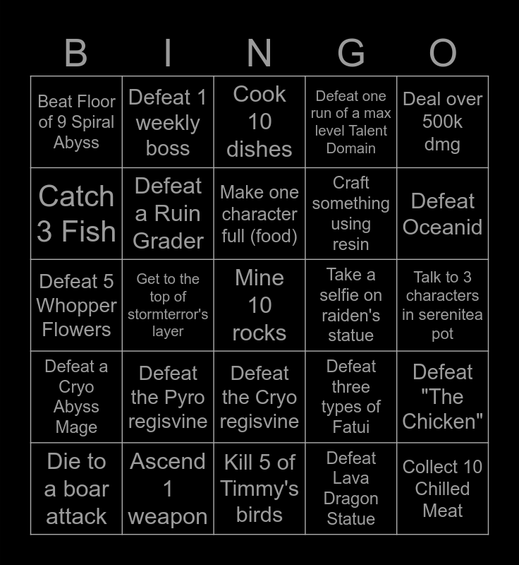 This bingo card has 25 words: Defeat the Pyro regisvine, Kill 5 of Timmy's birds, Make one character full (food), Die to a boar attack, Deal over 500k dmg, Beat Floor of 9 Spiral Abyss, Catch 3 Fish, Defeat 1 weekly boss, Take a selfie on raiden's statue, Defeat the Cryo regisvine, Craft something using resin, Defeat 5 Whopper Flowers, Defeat three types of Fatui, Defeat "The Chicken", Defeat a Ruin Grader, Collect 10 Chilled Meat, Talk to 3 characters in serenitea pot, Cook 10 dishes, Defeat Oceanid, Get to the top of stormterror's layer, Mine 10 rocks, Ascend 1 weapon, Defeat a Cryo Abyss Mage, Defeat one run of a max level Talent Domain and Defeat Lava Dragon Statue.