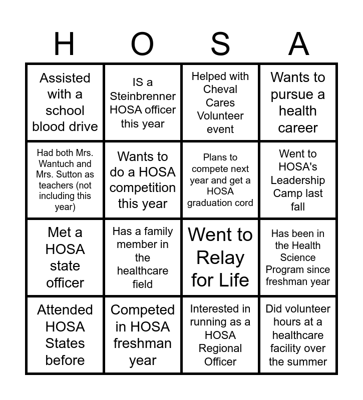 This bingo card has 16 words: Competed in HOSA freshman year, Has been in the Health Science Program since freshman year, Helped with Cheval Cares Volunteer event, Assisted with a school blood drive, Met a HOSA state officer, IS a Steinbrenner HOSA officer this year, Went to Relay for Life, Interested in running as a HOSA Regional Officer, Had both Mrs. Wantuch and Mrs. Sutton as teachers (not including this year), Wants to do a HOSA competition this year, Attended HOSA States before, Wants to pursue a health career, Has a family member in the healthcare field, Went to HOSA's Leadership Camp last fall, Plans to compete next year and get a HOSA graduation cord and Did volunteer hours at a healthcare facility over the summer.