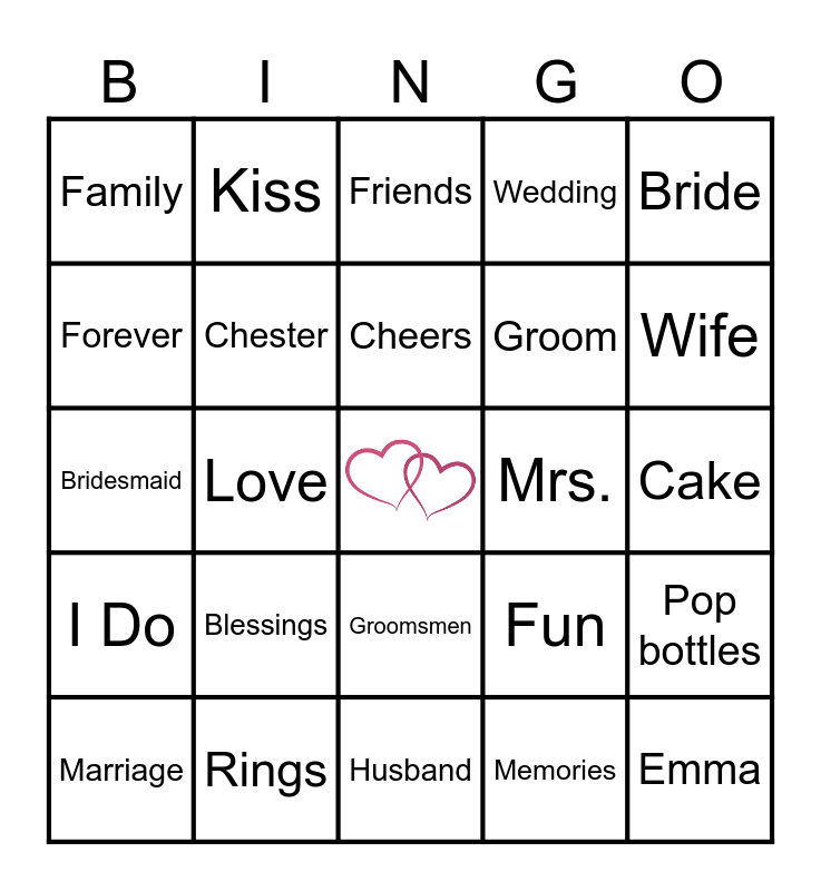 This bingo card has a free space and 29 words: Marriage, Nick, Love, Dance, Family, Friends, Chester, Blessings, Mrs., Rings, Cake, Emma, Husband, Memories, Wife, Flowers, Groomsmen, I Do, Bride, Bridesmaid, Fun, He put a ring on it!, Groom, Forever, Wedding, Kiss, Pop bottles, Cheers and Dress.