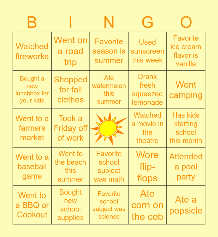 This bingo card has a free space and 24 words: Went to the beach this summer, Bought new school supplies, Ate watermelon this summer, Went to a BBQ or Cookout, Favorite ice cream flavor is vanilla, Watched fireworks, Bought a new lunchbox for your kids, Went on a road trip, Watched a movie in the theatre, Favorite school subject was math, Drank fresh squeezed lemonade, Went to a farmers market, Wore flip-flops, Attended a pool party, Shopped for fall clothes, Ate corn on the cob, Has kids starting school this month, Favorite season is summer, Went camping, Took a Friday off of work, Ate a popsicle, Went to a baseball game, Used sunscreen this week and Favorite school subject was science.