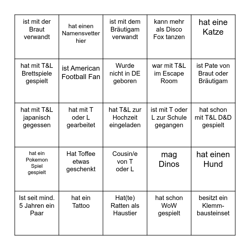 This bingo card has 25 words: Hat Toffee etwas geschenkt, Hat(te) Ratten als Haustier, Wurde nicht in DE geboren, Ist seit mind. 5 Jahren ein Paar, hat eine Katze, ist mit der Braut verwandt, hat mit T&L Brettspiele gespielt, hat einen Namensvetter hier, ist mit T oder L zur Schule gegangen, Cousin/e von T oder L, war mit T&L im Escape Room, hat mit T&L japanisch gegessen, mag Dinos, hat einen Hund, ist American Football Fan, besitzt ein Klemm-bausteinset, hat schon mit T&L D&D gespielt, ist mit dem Bräutigam verwandt, ist Pate von Braut oder Bräutigam, hat mit T oder L gearbeitet, hat T&L zur Hochzeit eingeladen, hat ein Tattoo, hat ein Pokemon Spiel gespielt, kann mehr als Disco Fox tanzen and hat schon WoW gespielt.