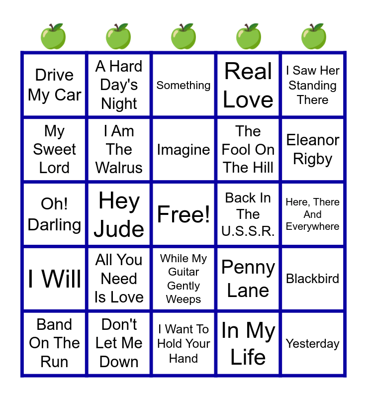 This bingo card has a free space and 42 words: Let It Be, Imagine, Here Comes The Sun, All You Need Is Love, In My Life, Blackbird, Yesterday, Twist And Shout, Something, While My Guitar Gently Weeps, Here, There And Everywhere, Eleanor Rigby, Hey Jude, I Saw Her Standing There, Octopus's Garden, Penny Lane, With A Little Help From My Friends, Oh! Darling, Strawberry Fields Forever, A Hard Day's Night, My Sweet Lord, Ticket To Ride, Love Me Do, Drive My Car, Hello, Goodbye, Revolution, The Fool On The Hill, I Feel Fine, Yellow Submarine, All Those Years Ago, Beautiful Boy (Darling Boy), I Will, I Am The Walrus, I Want To Hold Your Hand, Sgt Pepper's Lonely Hearts Club Band, Band On The Run, Don't Let Me Down, Back In The U.S.S.R., Day Tripper, Girl, Real Love and Can't Buy Me Love.