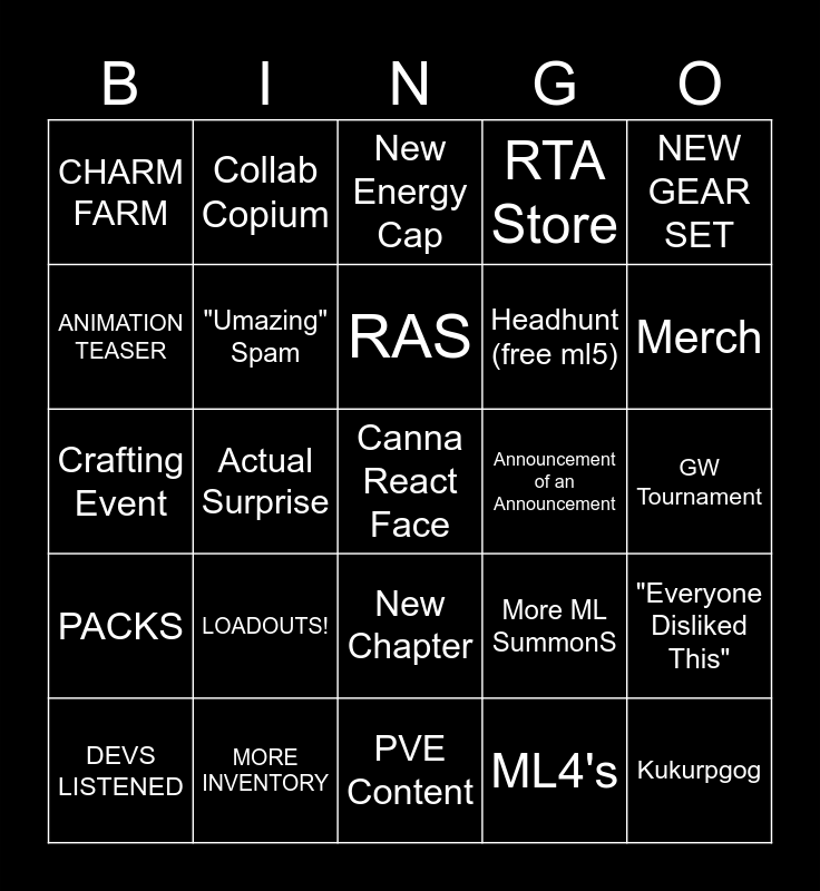This bingo card has a free space and 24 words: LOADOUTS!, MORE INVENTORY, RAS, DEVS LISTENED, NEW GEAR SET, CHARM FARM, ANIMATION TEASER, Collab Copium, Announcement of an Announcement, New Chapter, Headhunt (free ml5), Crafting Event, More ML SummonS, "Everyone Disliked This", "Umazing" Spam, ML4's, GW Tournament, New Energy Cap, Merch, Actual Surprise, Kukurpgog, PACKS, RTA Store and PVE Content.
