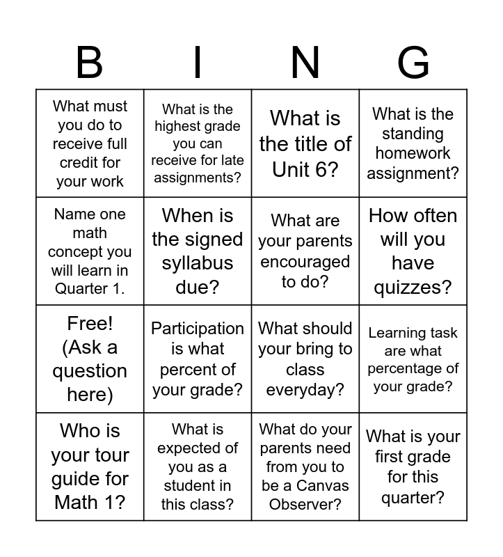 This bingo card has 20 words: Learning task are what percentage of your grade?, What is your teacher's email address?, What is the title of Unit 6?, How many days do you have to make up missing work?, Who is your tour guide for Math 1?, Name one math concept you will learn in Quarter 1., What is expected of you as a student in this class?, What must you do to receive full credit for your work, Free! (Ask a question here), What is the highest grade you can receive for late assignments?, Participation is what percent of your grade?, What should your bring to class everyday?, When is the signed syllabus due?, What is your first grade for this quarter?, What are your parents encouraged to do?, What day is tutoring offered?, How often will you have quizzes?, What is the standing homework assignment?, What do your parents need from you to be a Canvas Observer? and What is the cut off for turning in missing assignments?.
