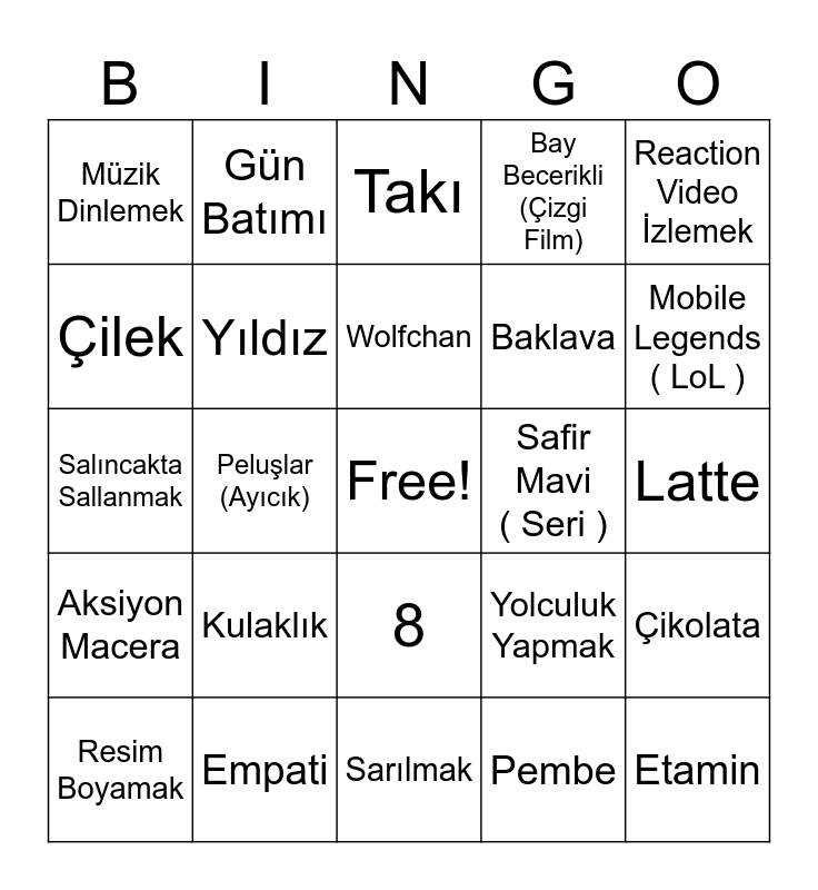 This bingo card has a free space and 24 words: Kulaklık, Empati, Wolfchan, Resim Boyamak, Reaction Video İzlemek, Müzik Dinlemek, Çilek, Gün Batımı, Safir Mavi ( Seri ), 8, Baklava, Salıncakta Sallanmak, Yolculuk Yapmak, Çikolata, Yıldız, Pembe, Latte, Takı, Mobile Legends ( LoL ), Peluşlar (Ayıcık), Etamin, Aksiyon Macera, Bay Becerikli (Çizgi Film) and Sarılmak.