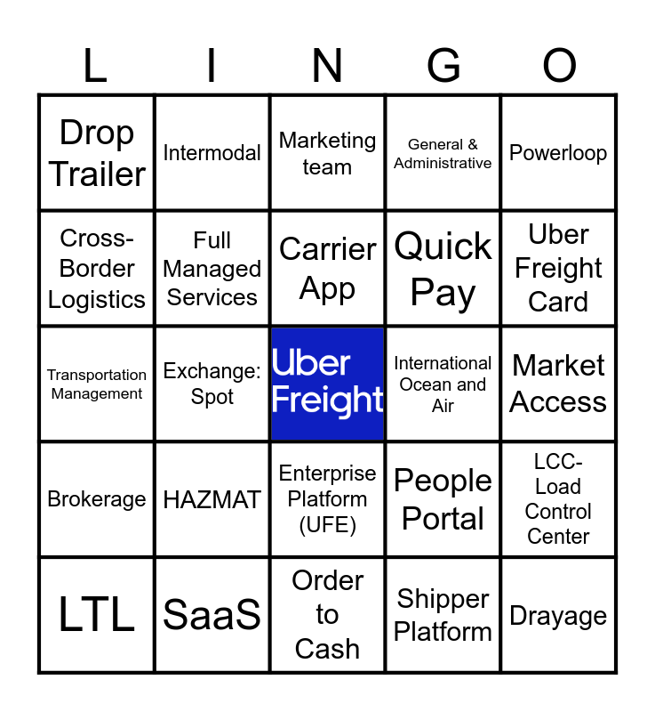This bingo card has a free space and 24 words: HAZMAT, SaaS, Carrier App, LTL, Powerloop, Drop Trailer, Cross-Border Logistics, Intermodal, International Ocean and Air, Enterprise Platform (UFE), Quick Pay, Transportation Management, People Portal, LCC- Load Control Center, Full Managed Services, Shipper Platform, Market Access, Marketing team, Uber Freight Card, Exchange: Spot, Drayage, Brokerage, General & Administrative and Order to Cash.